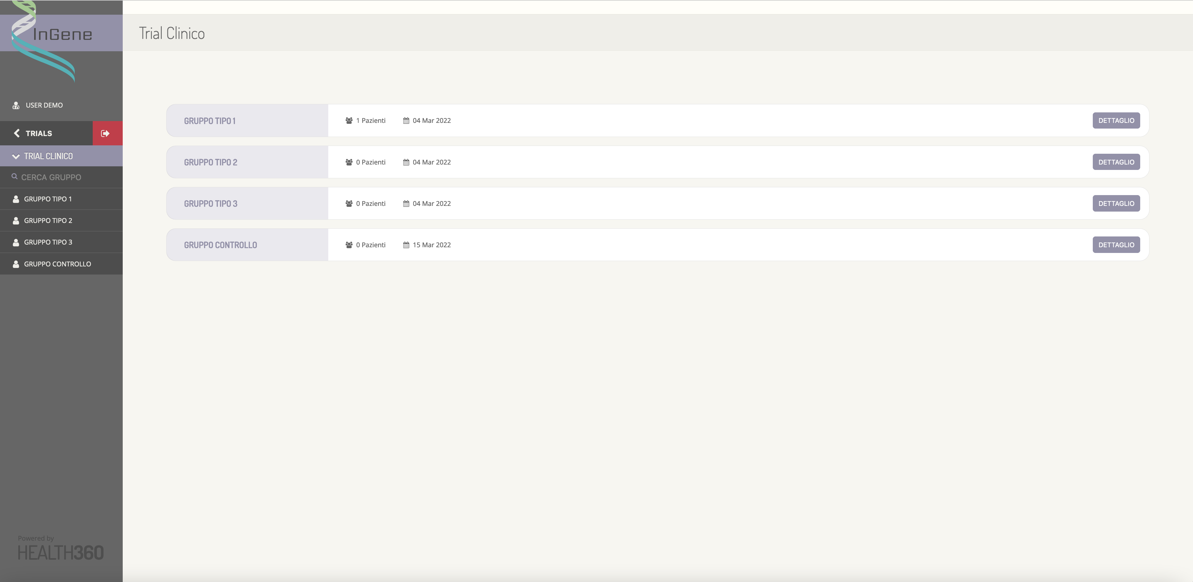Il modulo Trial consente di gestire trials clinici (che non sono oggetto specifico del progetto InGene 2.0) che si focalizzano su un insieme configurabile di dati ed eventi reperibili dalla piattaforma (storia clinica dei pazienti) ai fini di studiarne analogie e ricorrenze. Lo scopo è gestire trials clinici che si focalizzano su un insieme di dati ed eventi reperibili dalla storia clinica dei pazienti ai fini di studiarne analogie e ricorrenze. Il modulo implementato è completamente configurabile in base alla caratteristiche della CRF. I dati presenti nella CRF sono organizzati in ‘gruppi’ in base alle caratteristiche e ai backend dove sono archiviati. Ad ogni gruppo corrisponde un plugin del modulo Trial.