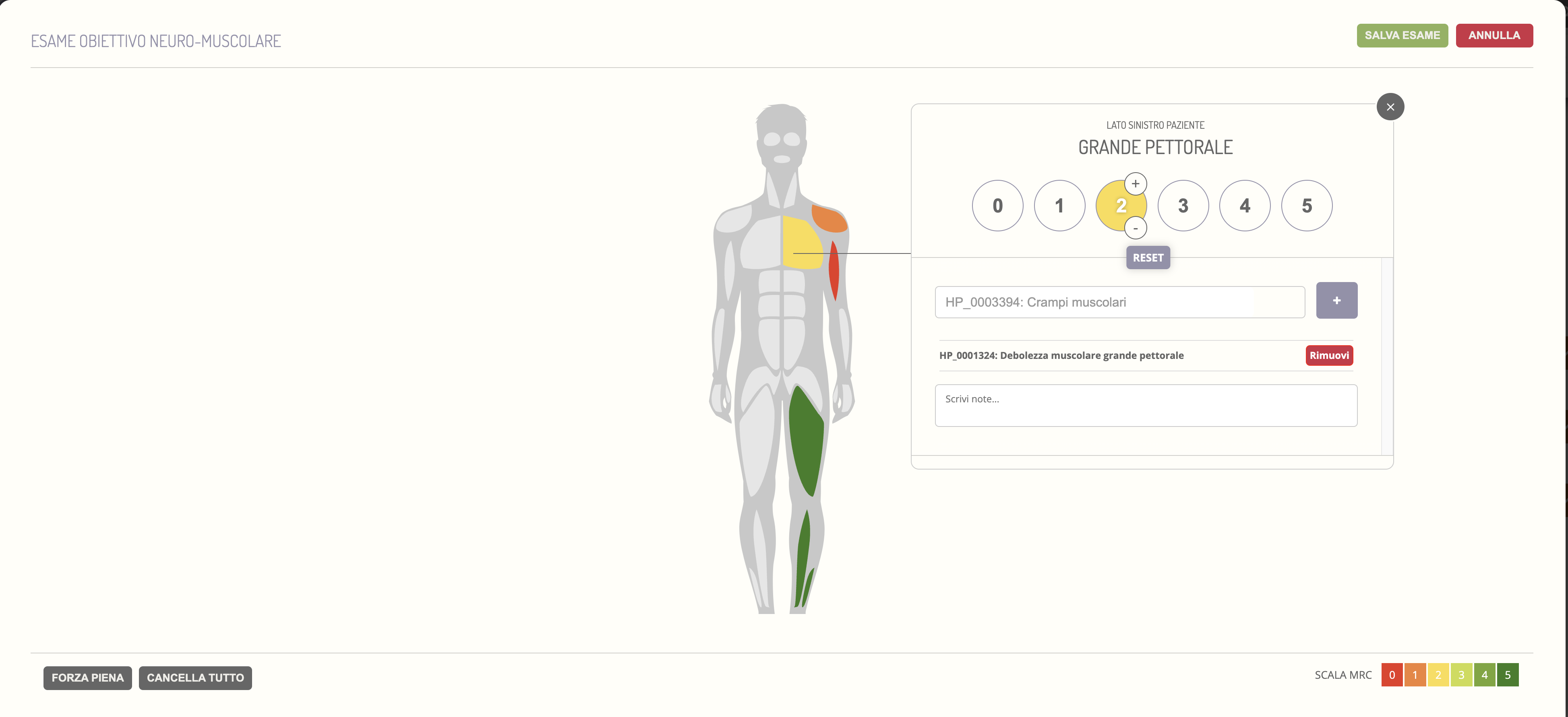 L'operatore, dopo aver selezionato il muscolo con un click, gli assegna un valore rispetto alla scala MRC e opzionalmente un insieme di codici HPO (Human Phenotype Ontology) che ne descrivono la funzionalità.