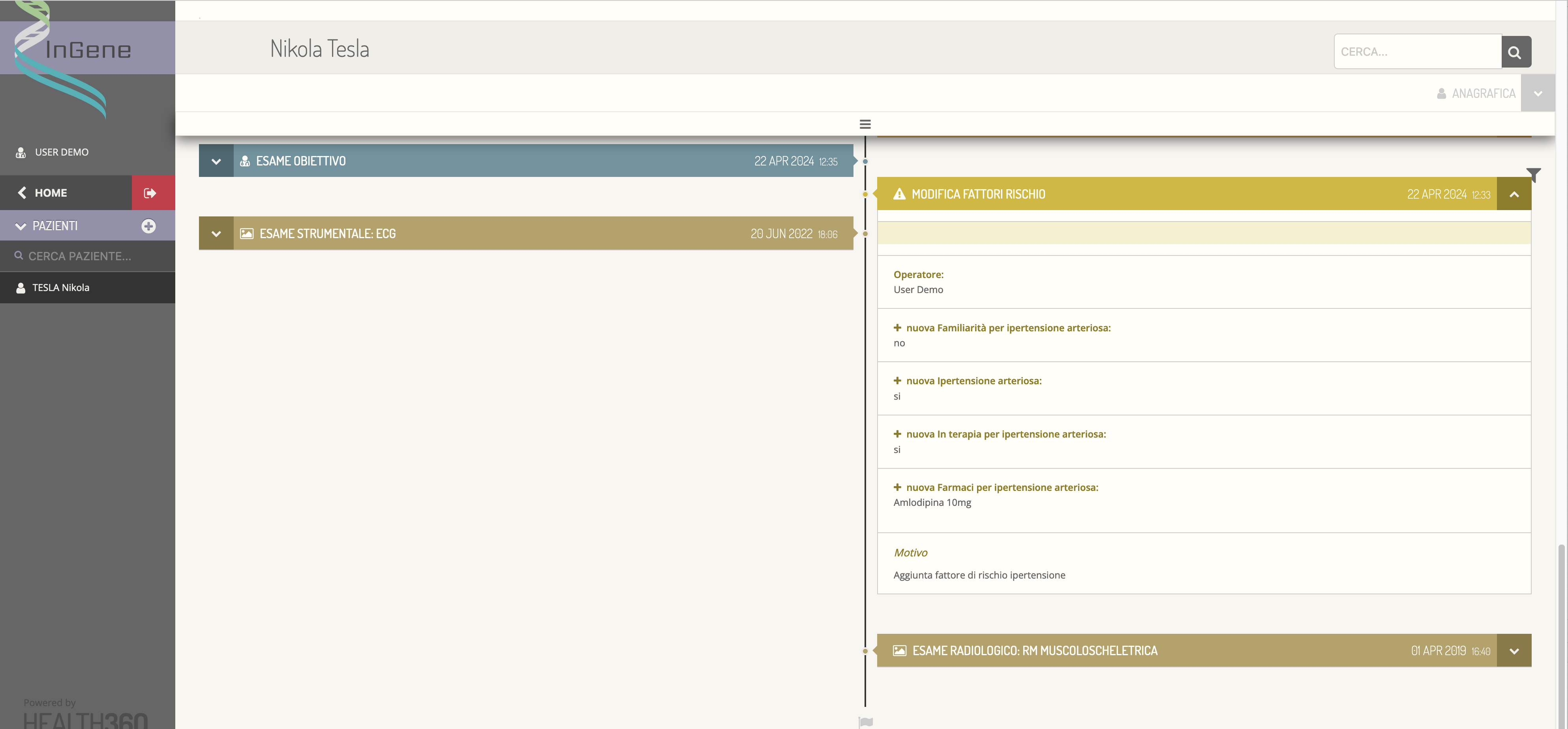 La modifica dei fattori di rischio corrisponde ad un evento nella timeline in cui vengono riportate le nuove informazioni e le modifiche.